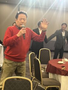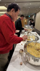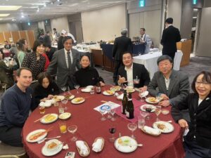 家族、友人などみなさんとおいしいお食事でクリスマスを楽しみましょうということで、親睦委員会からは「赤か緑か金」のものを身につけてくるようにとのお達しがあり、会場はおめかしした美男美女、そしてかわいらしいお子さんたちが集いました。