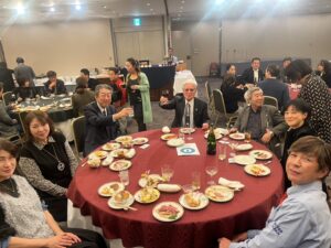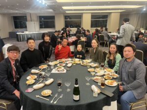 家族、友人などみなさんとおいしいお食事でクリスマスを楽しみましょうということで、親睦委員会からは「赤か緑か金」のものを身につけてくるようにとのお達しがあり、会場はおめかしした美男美女、そしてかわいらしいお子さんたちが集いました。